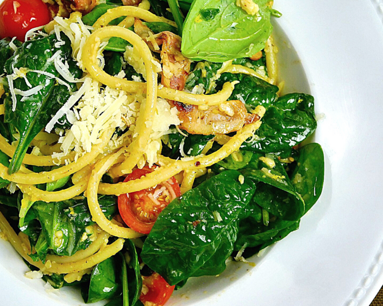 Bucatini ze szpinakiem i cytryną i pancettą i pomidorkami i piniolami i…
