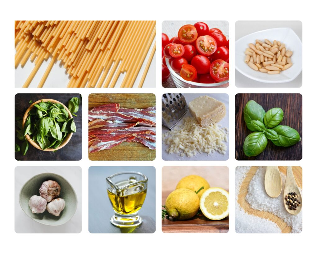 - Na patelni smażymy plasterki pancetty, czosnku oraz piniole. Dodajemy połówki pomidorków i liście bazylii.