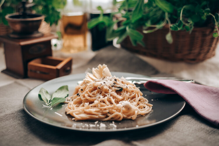 - Na patelni podgrzewamy oliwę, świeżo zmielony pieprz, kilka listków szałwii i kiedy ta ostatnia zacznie wydzielać aromat, dodajemy łyżkę masła i odstawiamy, aż makaron będzie gotowy.