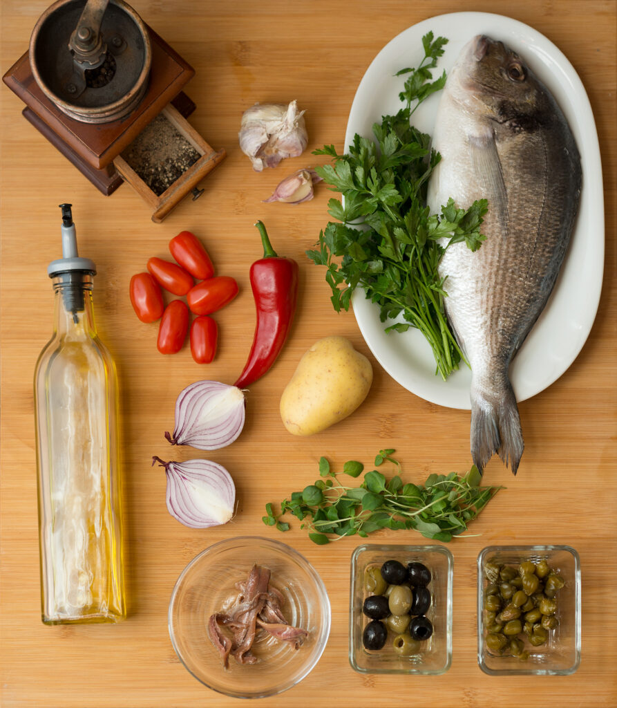 Dorada w winie, z kaparami, oliwkami i oregano w stylu puttanesca