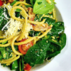 Bucatini ze szpinakiem i cytryną i pancettą i pomidorkami i piniolami i…