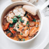 Jak już wyłożymy danie na talerz, najlepiej głęboki, taki do pasty lub na miseczkę, to podajmy z bagietką lub ciabattą. Z chlebem na zakwasie w stylu słowiańskim smakuje gorzej. Dobre białe lub nawet różowe wino będzie doskonałym towarzyszem. Może nawet być takie dojrzewające w beczce. W Do widzenia do jutra polecaliśmy klasowe Pinot Grigio, białe Bordeaux, Etna Bianco czy białą Rioję.