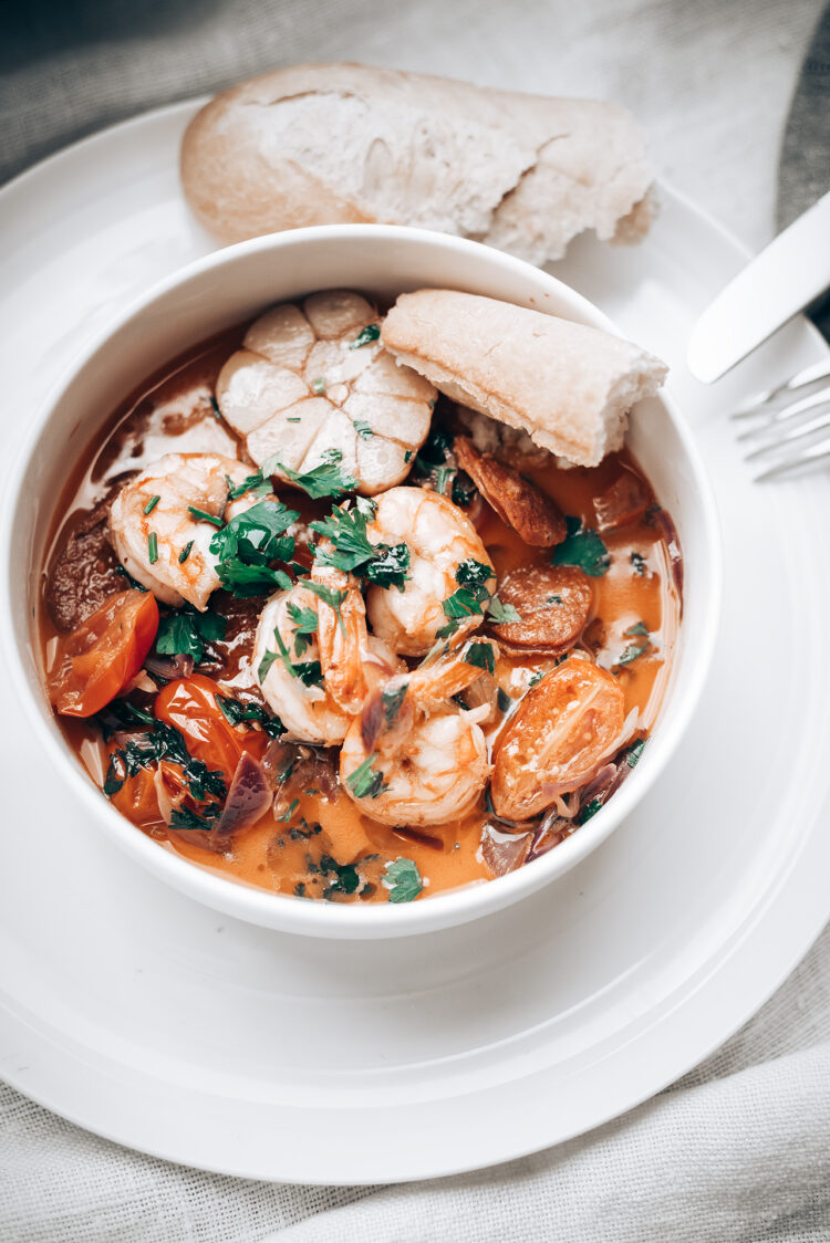 To takie danie, które wyszło spontanicznie. Podobną potrawę prezentował mój estoński kucharz, Karli, z którym przez chwilę prowadziliśmy malutkie bistro Magazyn Butelek na Brackiej. Za nic nie mogę sobie przypomnieć jak to, co on wtedy robił, smakowało, ale pamiętam, że robiło wrażenie i było smaczne bardzo. Po kilku latach, jak już musiałem zostać Szefem Kuchni gdzieś na Starej Pradze, tak z marszu, tak bez przygotowania, tak w jednej chwili, nigdy wcześniej nie pracując jako kucharz, to spróbowałem danie zrobić w oparciu o szczątki pamięci. Po hipotetycznym rozstrzygnięciu dylematów, jakie produkty, poza oczywiście krewetkami i brandy, wziąłem głęboki oddech i zrobiłem. Z małym błędem, bo rozwarstwiłem masło, ale po naprawie wyszły praktycznie tak, jak robię do tej pory.